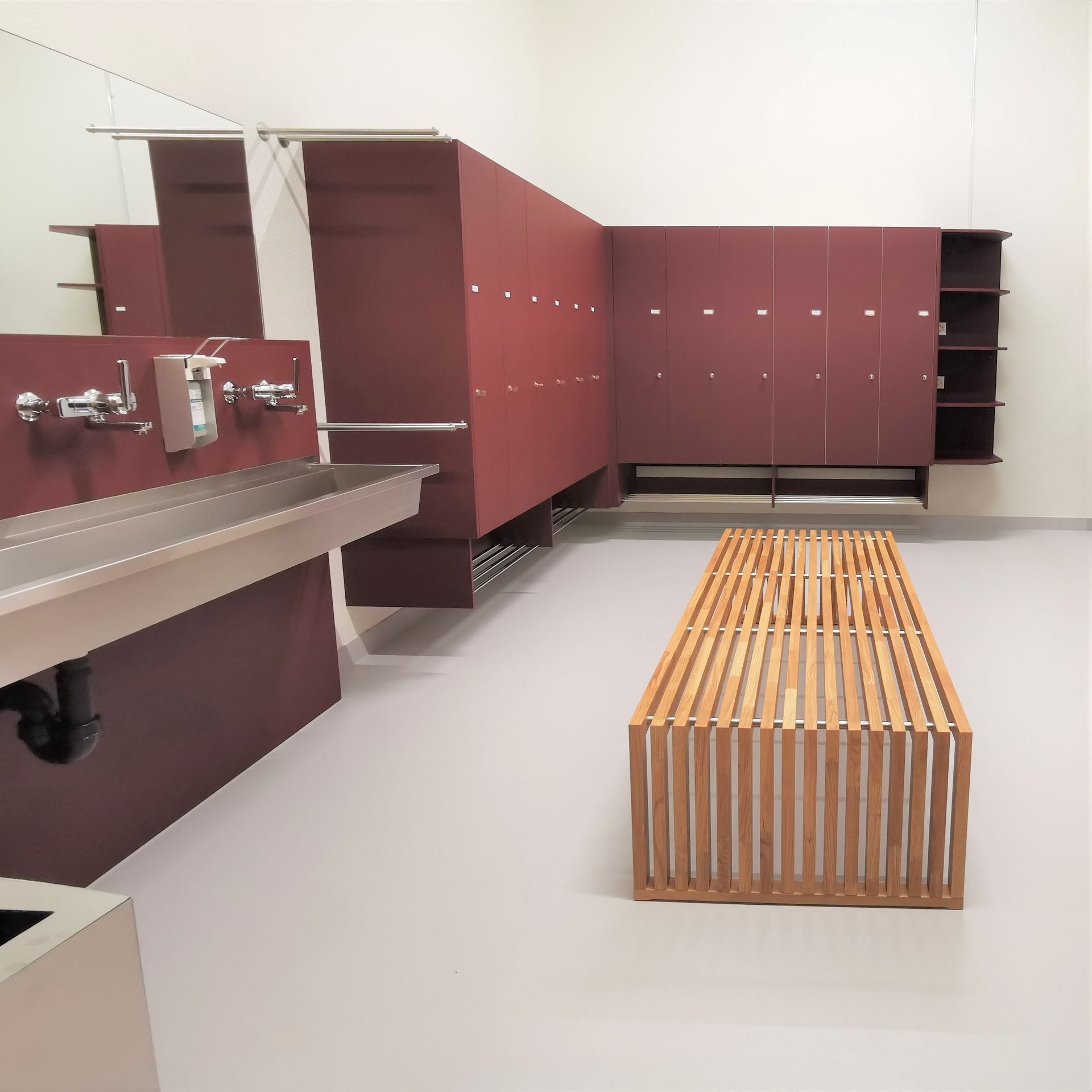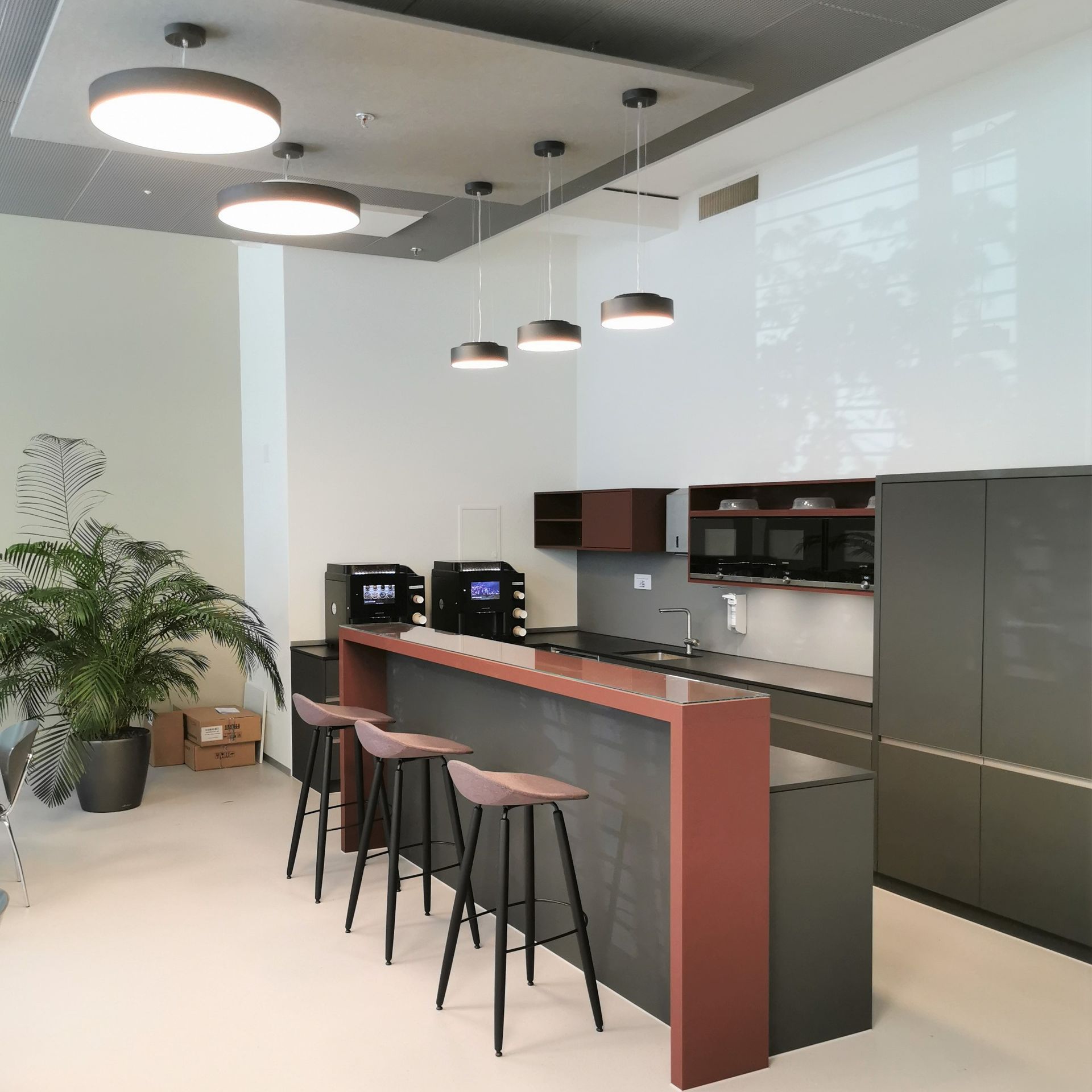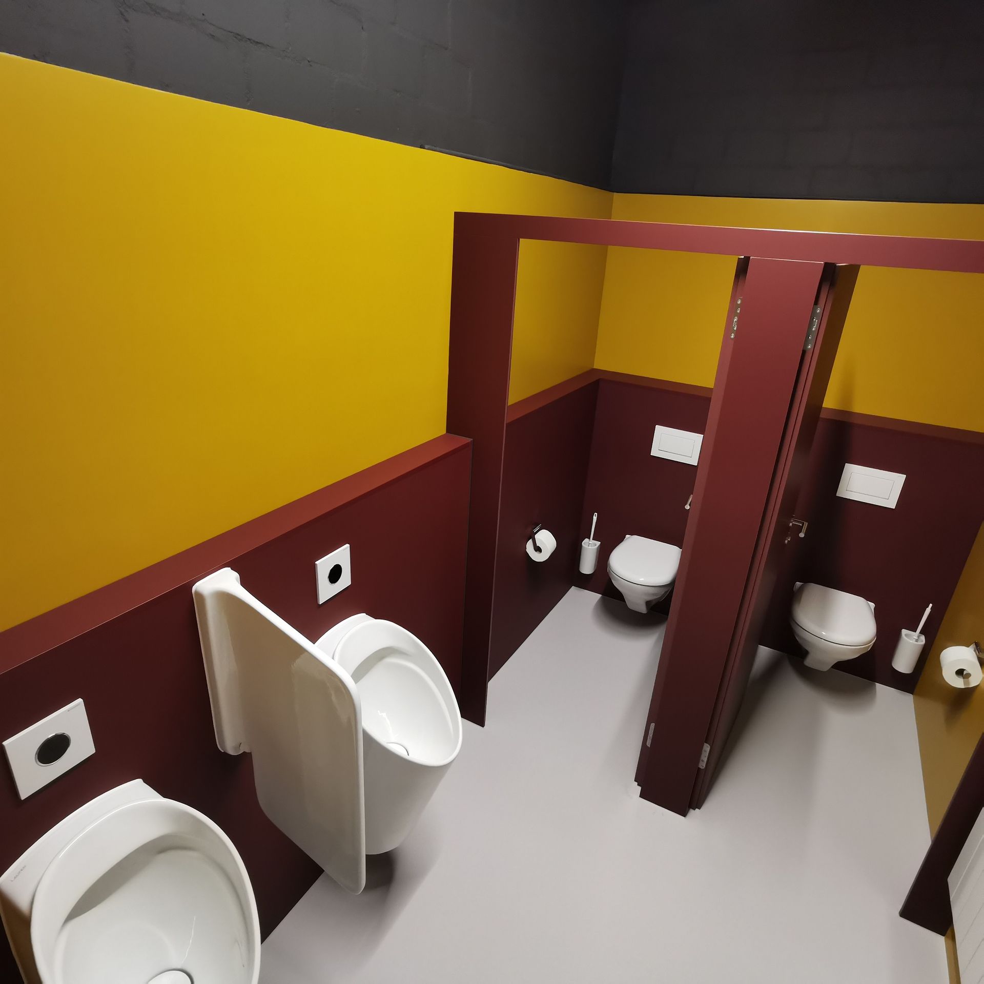 Der Gewerbekomplex besteht aus Neu- und Altbau Bereichen. In dieser Bauetappe widmete die innovative Firma das Augenmerk der Wertschätzung der Mitarbeitenden. Etliche Toiletten- und Garderobenanlagen sowie das Treppenhaus im Produktionsbereich wurden über mehrere Stockwerke mit moderner Farbgebung totalsaniert. Die zuvor eher nüchtern wirkende Cafeteria, lädt nun mittels neuer Küche mit Barbereich, schönen Leuchten auf Schalldämmelementen und passendem PU-Boden, zum Verweilen ein.