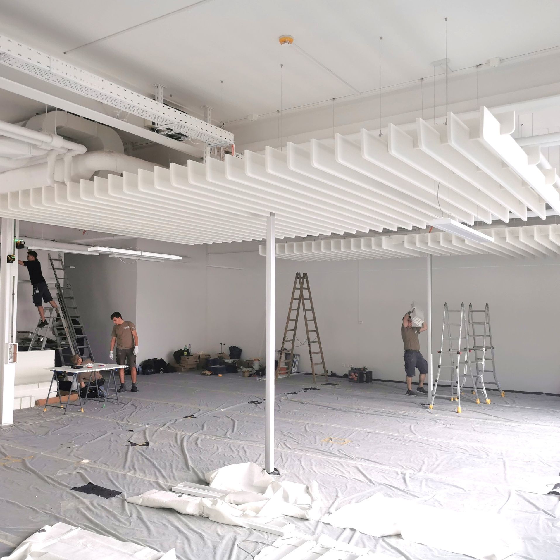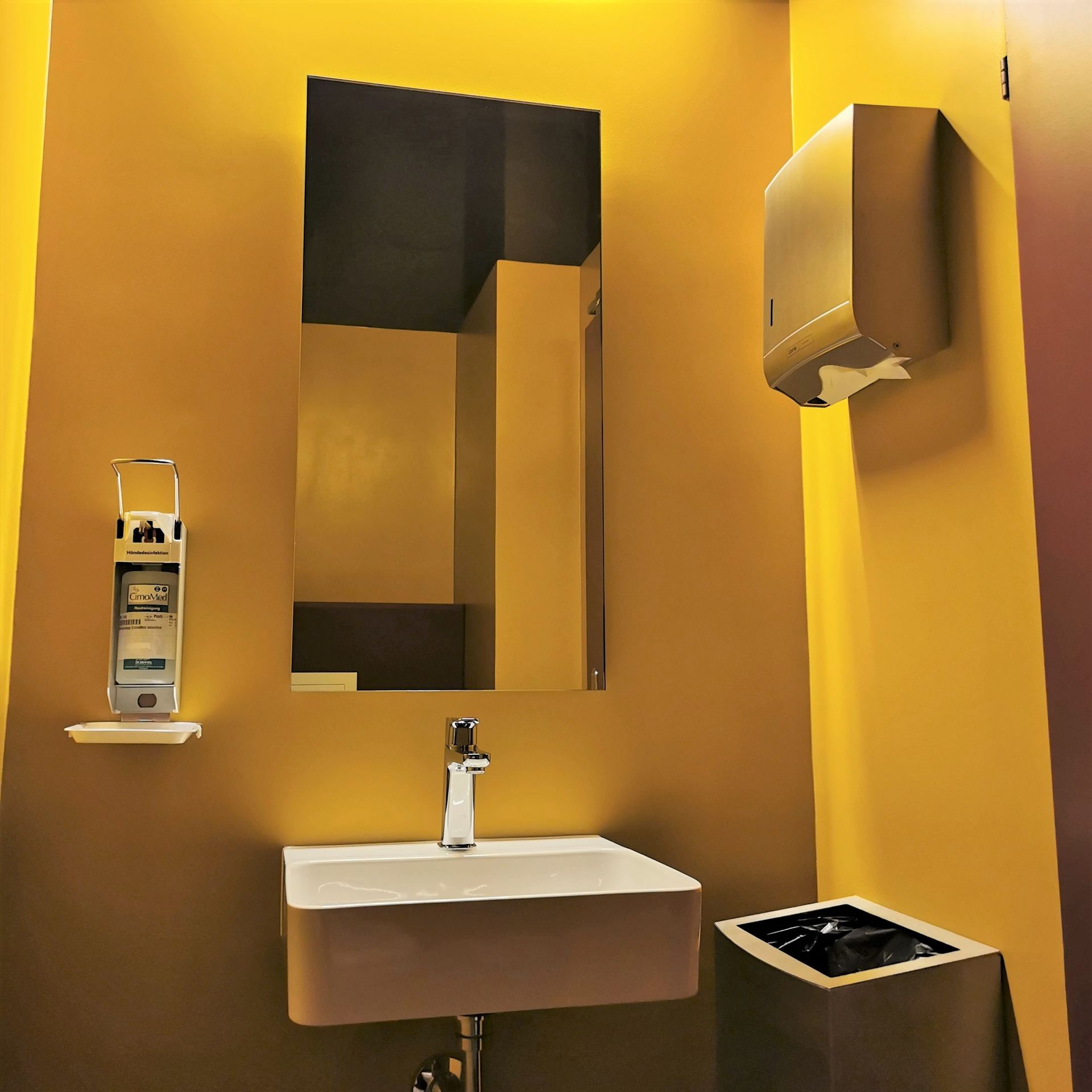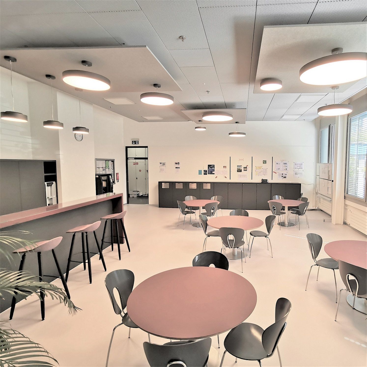 Der Gewerbekomplex besteht aus Neu- und Altbau Bereichen. In dieser Bauetappe widmete die innovative Firma das Augenmerk der Wertschätzung der Mitarbeitenden. Etliche Toiletten- und Garderobenanlagen sowie das Treppenhaus im Produktionsbereich wurden über mehrere Stockwerke mit moderner Farbgebung totalsaniert. Die zuvor eher nüchtern wirkende Cafeteria, lädt nun mittels neuer Küche mit Barbereich, schönen Leuchten auf Schalldämmelementen und passendem PU-Boden, zum Verweilen ein.
