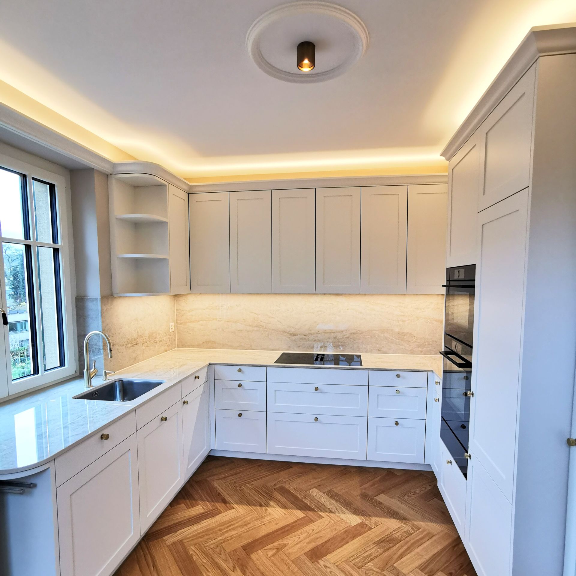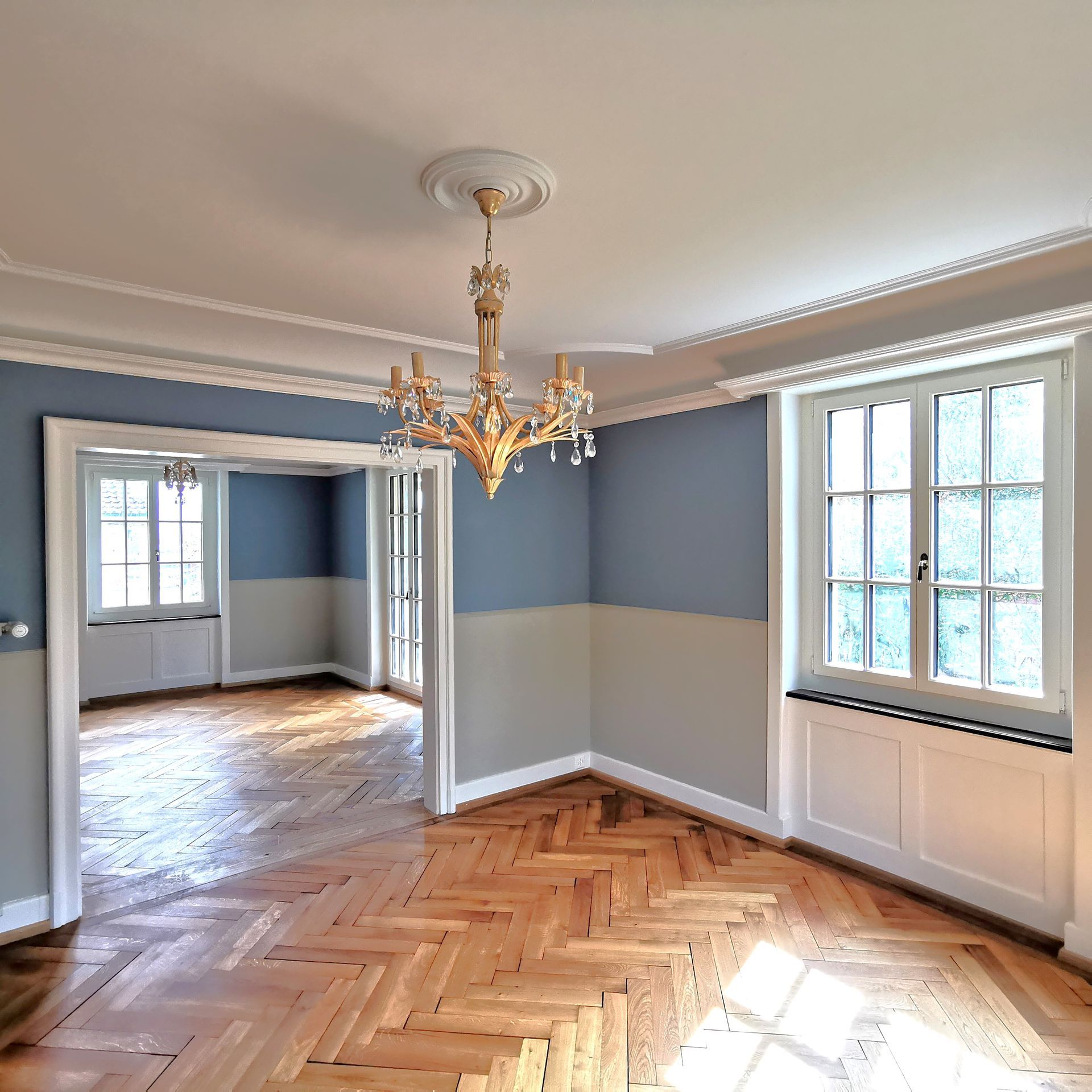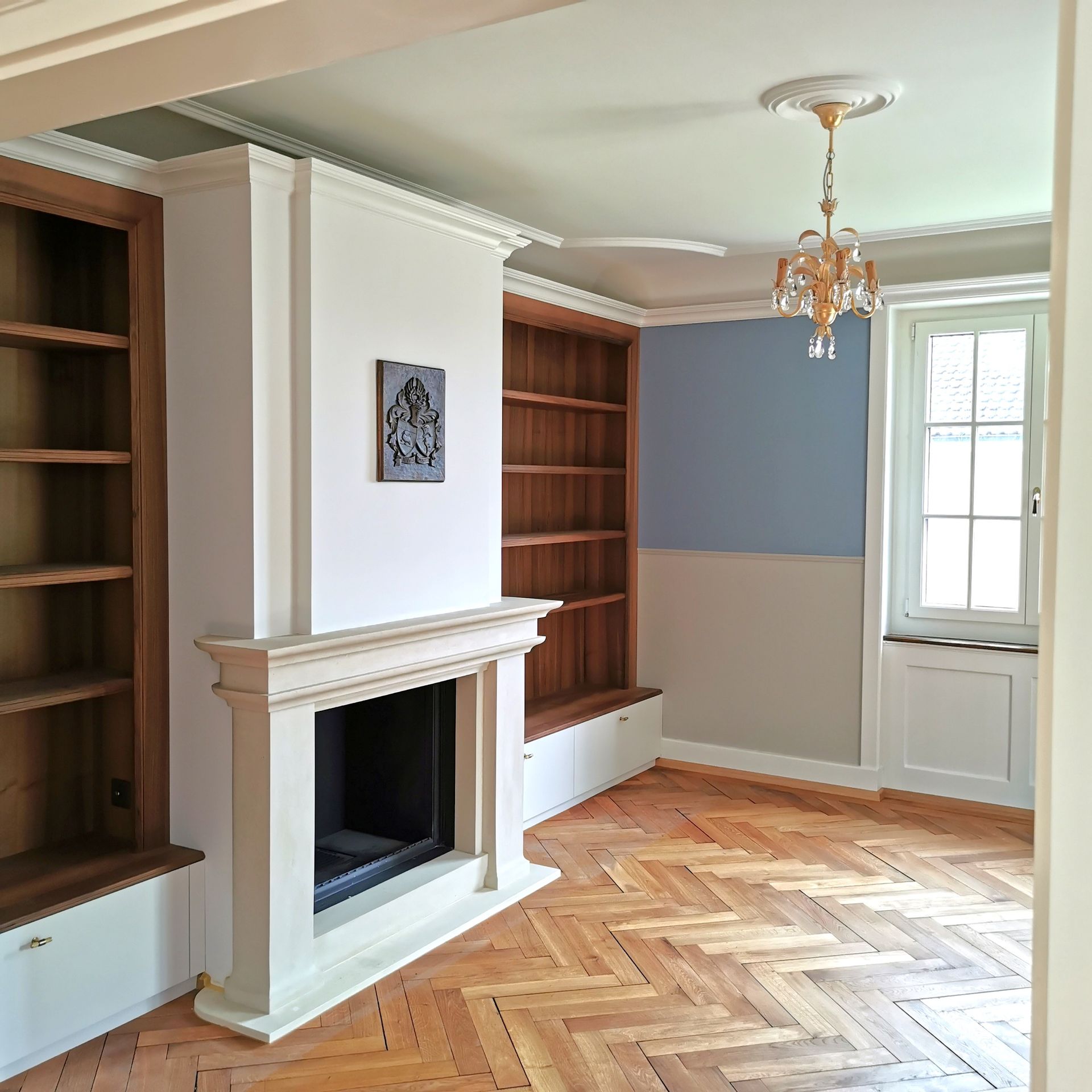 Das prachtvolle alte Familien-Haus musste wegen substanzieller Schäden liebevoll saniert werden. Das Dach wurde neu mit einem Unterdach und Wärmedämmung ausgestattet. Bei diesem Eingriff konnte unter Einbezug der Denkmalpflege eine Lukarne analog dem Nachbarhaus realisiert werden. Nebst der Sanierung des charaktervollen, stilechten Raumprogramms wurden Küche und Bäder spannend und mutig-modern umgebaut.