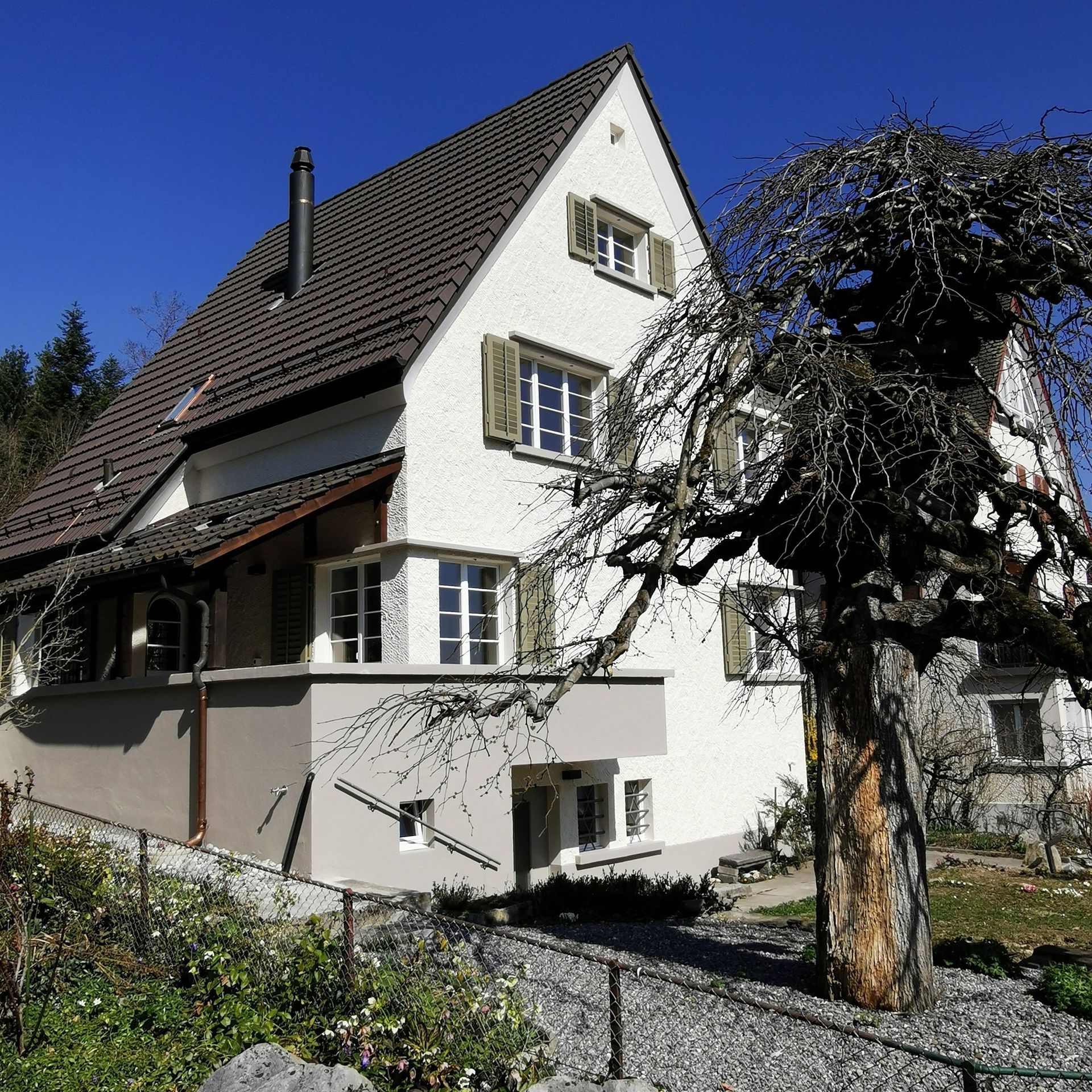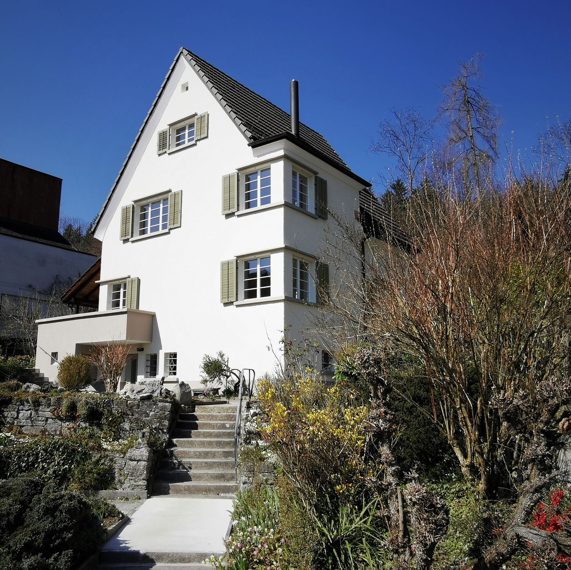 Der Umbau verwandelte das grosse Einfamilienhaus in drei Stockwerkwohnungen. Bewusst unauffällig wurde der Anbauteil und der zusätzliche Balkon integriert. Der vormalige Galeriebereich wurde zugunsten der Dachwohnung mit Lukarne und Bodenkonstruktion ergänzt. Nebenräume wurden mit angepasster Befensterung in das Wohnkonzept integriert. Neue Nasszellen sowie ein Treppenhauskern wurden gekonnt eingefügt. Zusätzliche Parkiermöglichkeiten, eine vereinfachte Umgebungsgestaltung und eine Voltaikanlage wurden realisiert.