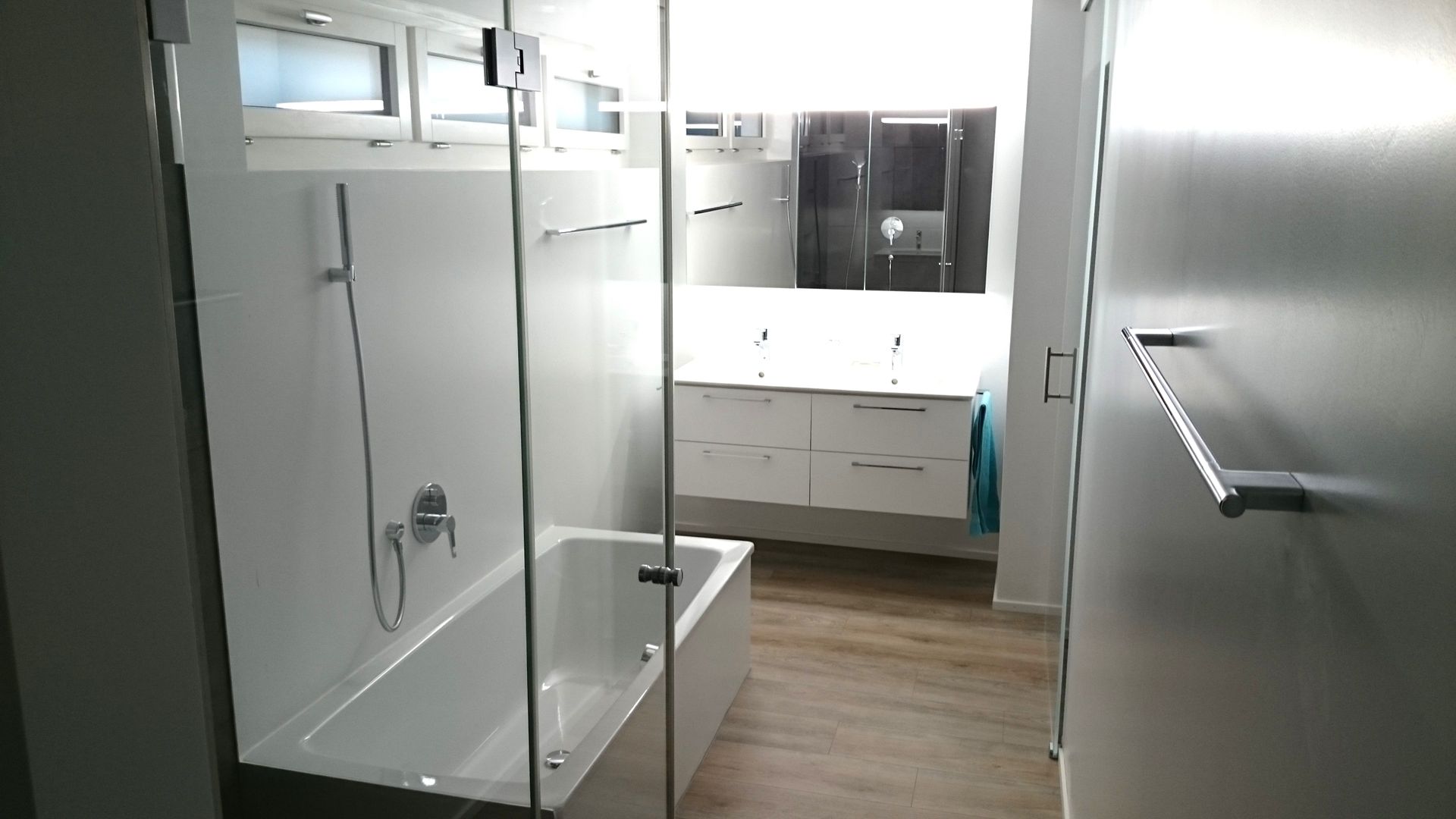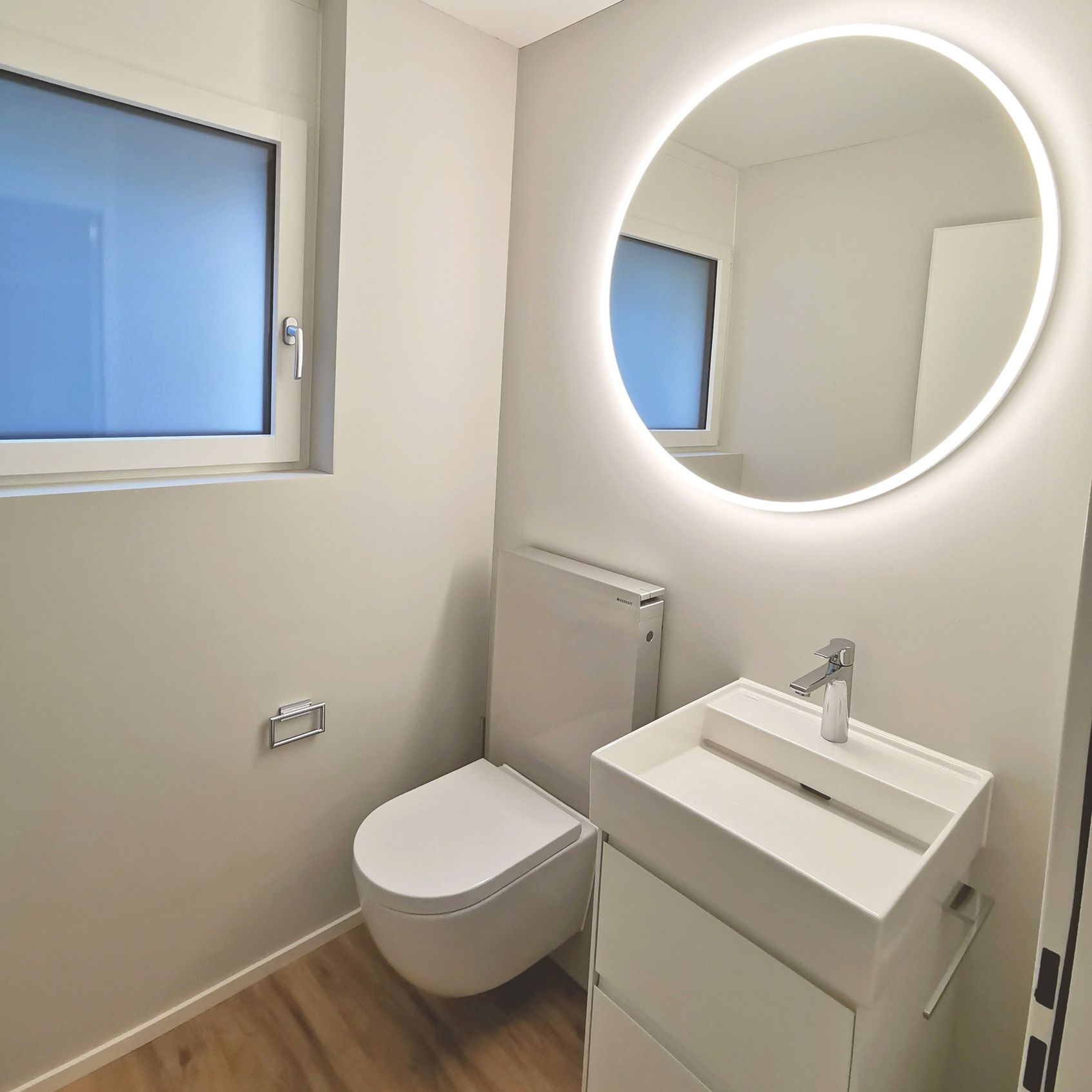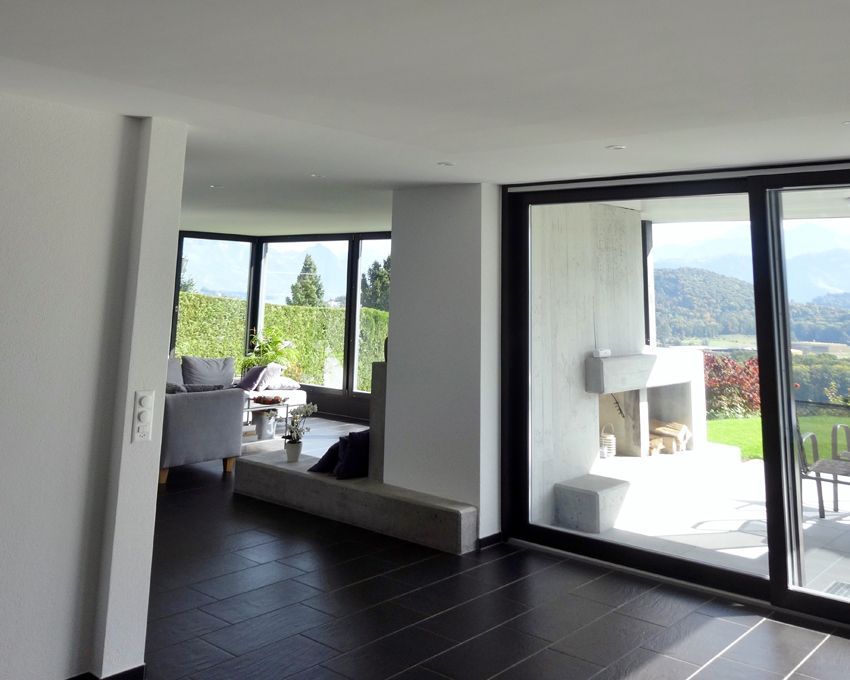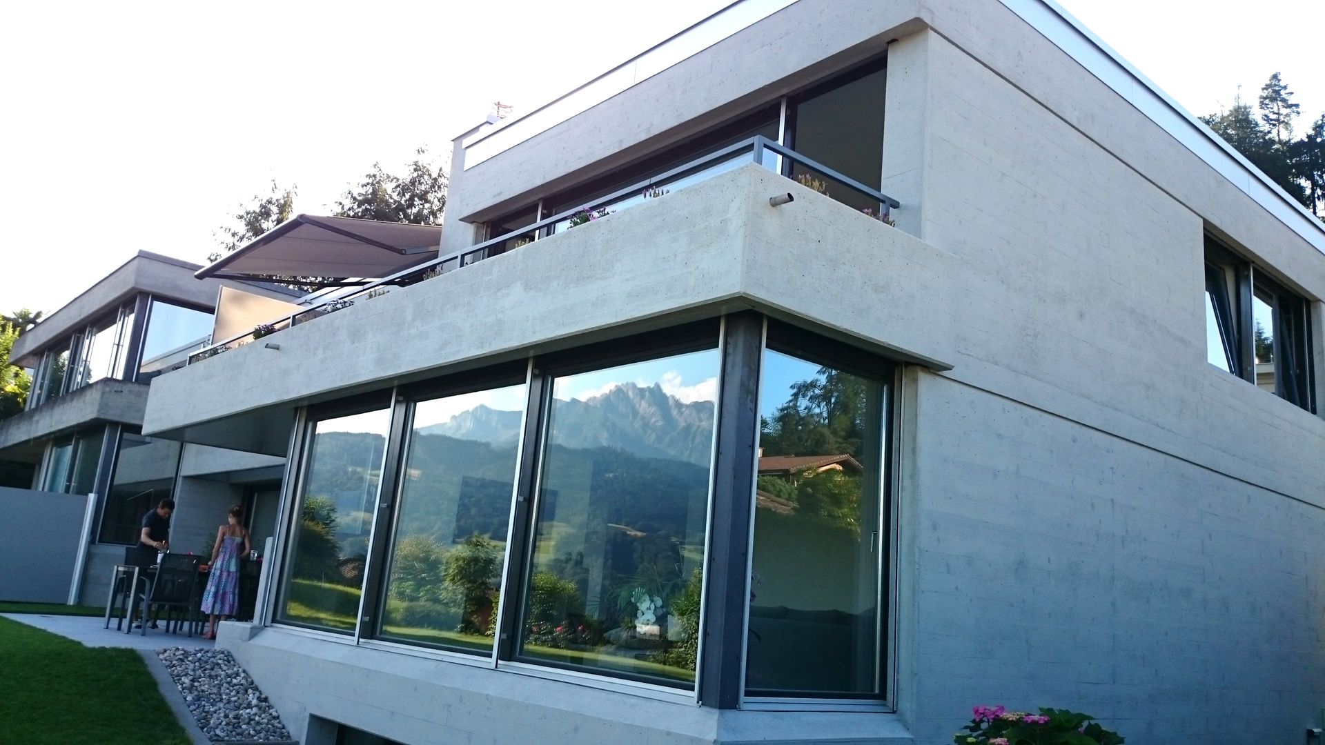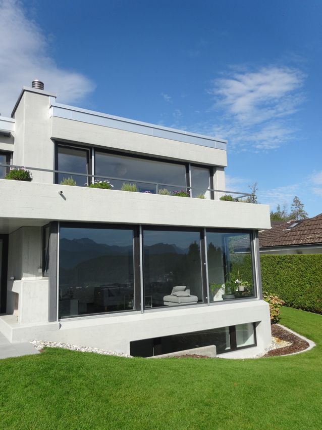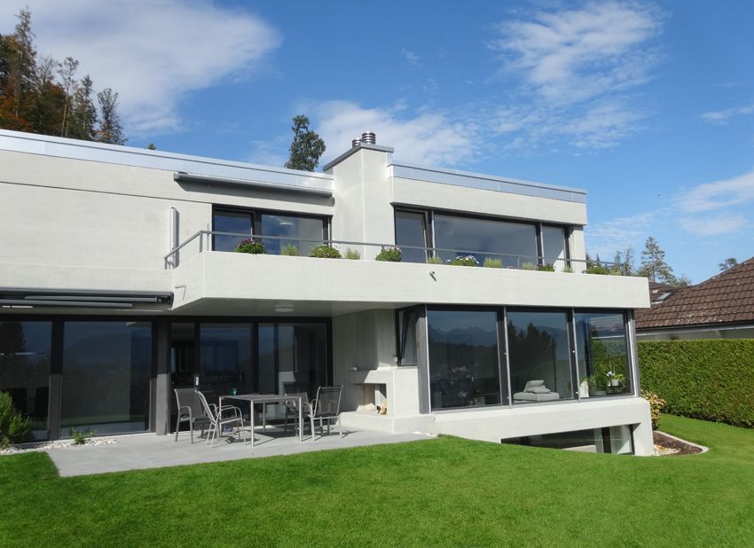 Nach erfolgreicher Käuferberatungs-Unterstützung konnte das Innenleben den Bedürfnissen der Bauherrschaft angepasst werden. Nebst neuen Oberflächenmaterialien wurde das UG ausgebaut und ein grosses Bad realisiert. Die Sanierung der Betonfassade und des vormals undichten Flachdachs stellte mit der konstruktiv gegebenen Innendämmung eine spezielle Herausforderung. Das aus den 80er-Jahren stammende moderne, grosszügige Haus hat eine atemberaubende Berg- und Seesicht, welche neu auch von lauschigen Aussenplätzen genossen werden kann.
