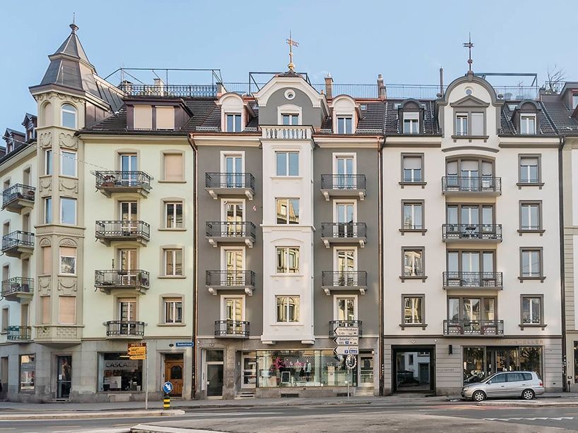 Die Dachstockwohnung mit Terrasse im vormaligen Estrich ist eines der Highlights der Totalsanierung und Umbau des über 80-jährigen Wohn- und Geschäftshauses. Spezielle Massnahmen waren für die Einbringung der vorfabrizierten Stahl- und Betonelemente der Balkonanbauten im Innenhof erforderlich. Die Installationen unterzog man einem Komplettersatz. Beim Innenausbau entstand ein spannender Mix aus bestehender Substanz und Neuem. Die Fassaden wurden aus denkmalpflegerischer Sicht sanft, aber – speziell im Lukarnenbereich – äussert aufwendig rekonstruiert.