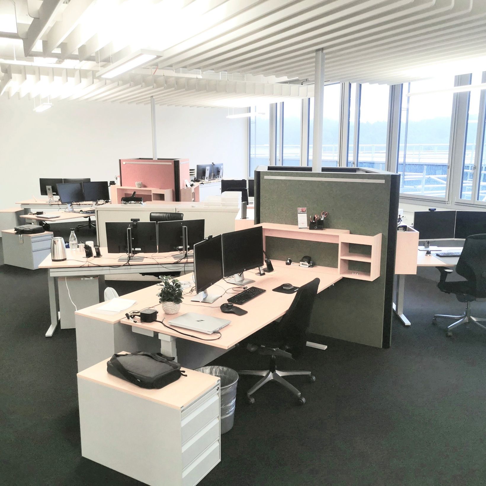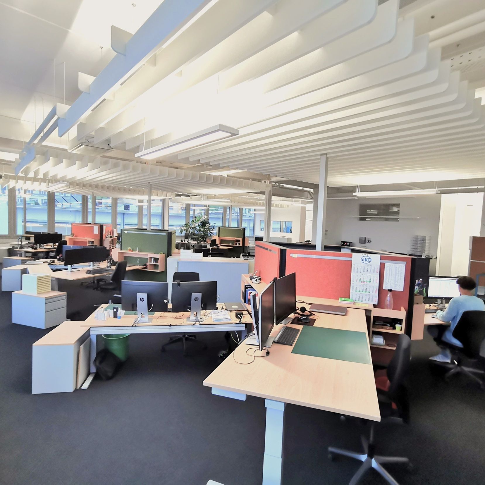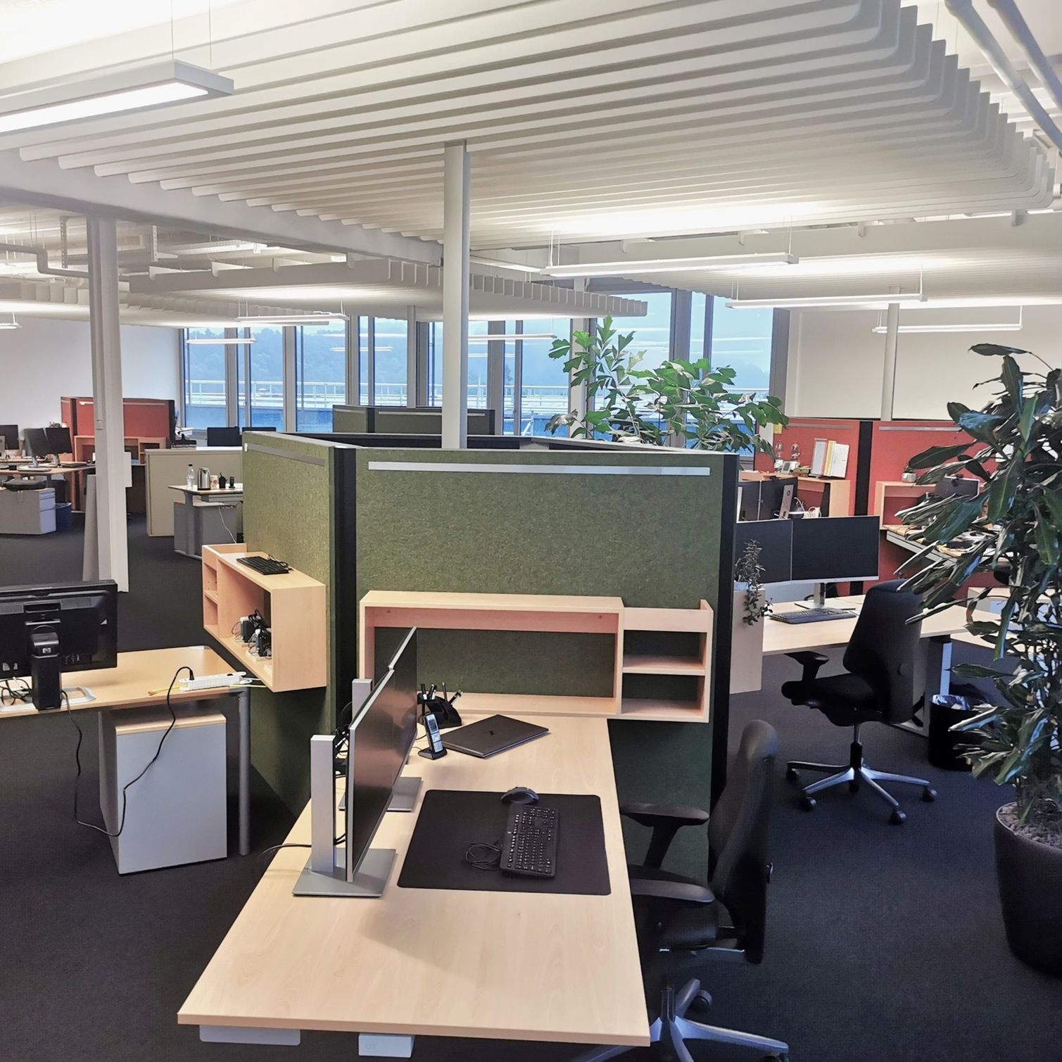 Bei der Realisierung des Grossraumbüros wurde mit grossflächigen Decken-Akustikelementen gearbeitet, in welche sowohl die Beleuchtung wie die Lüftung integriert ist. Die eigens entwickelten Möbelinseln erlauben eine dezente und variable Verkabelung der Arbeitsplätze und schaffen eine lockere und zugleich etwas abgeschirmte Pultanordnung.